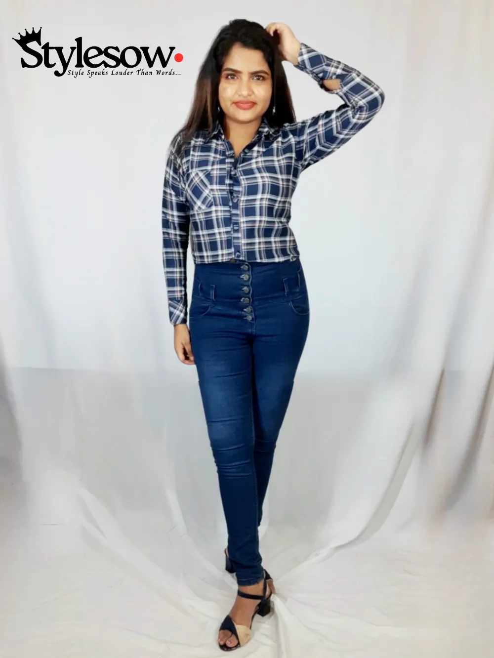 Long Sleeve Check Blouse-Blue